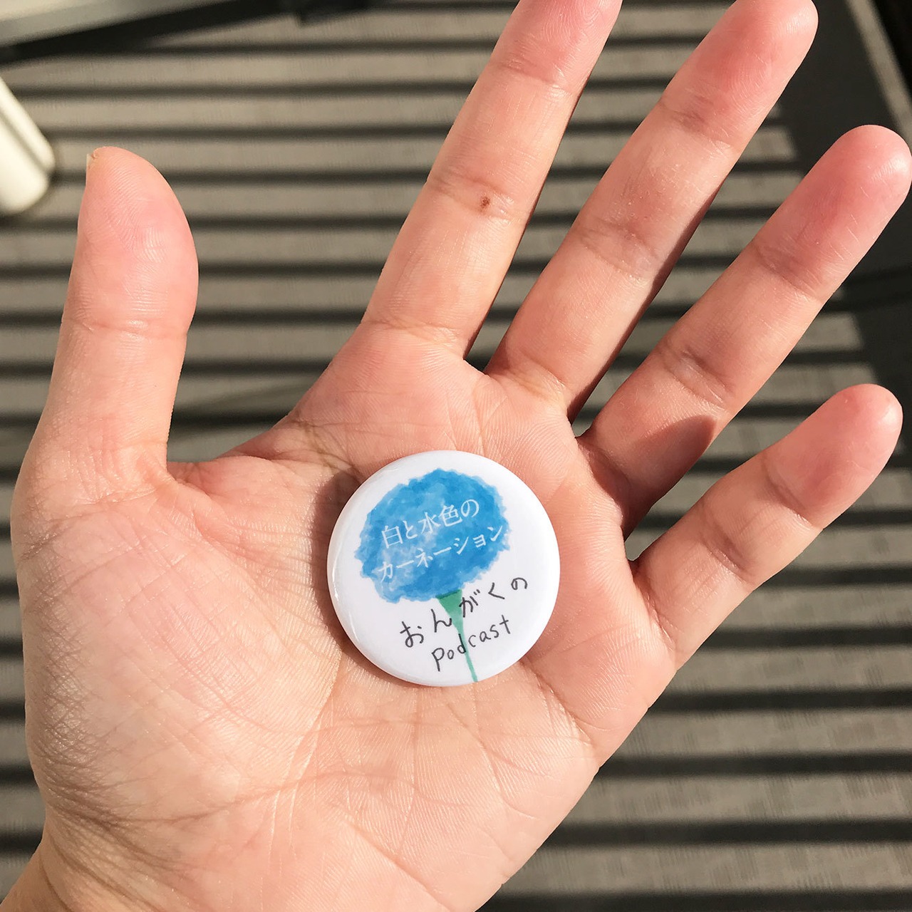白と水色のカーネーションのポッドキャストで使用しているアートワークがモチーフの缶バッチです。
